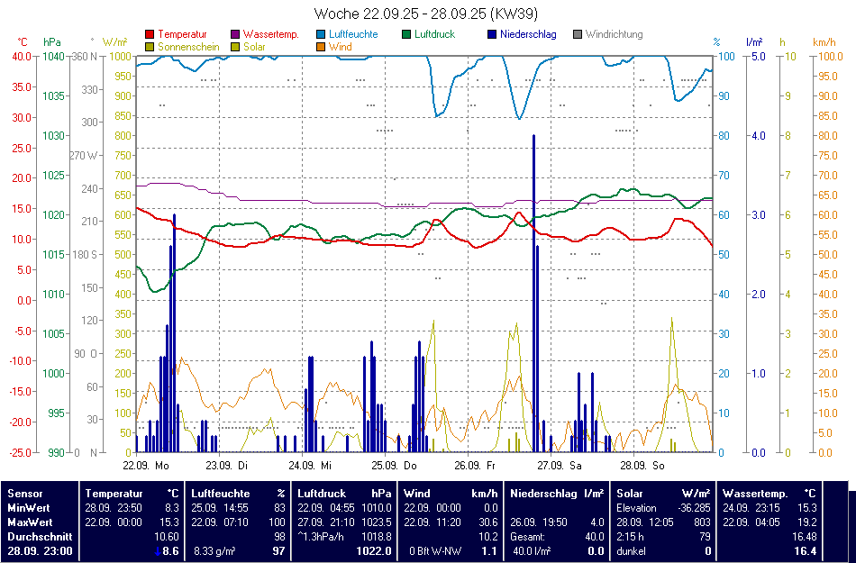 Die Niederderschlagswerte und Winddaten auf dieser Seite, sowie auf allen Seiten mit Daten unserer digitalen Wetterstation, sind besonders im Winterhalbjahr mit Vorsicht zu genießen, da bei Frost die Wetterparameter Niederschlag, Windstärke und zum Teil auch Windrichtung zeitweise nicht angezeigt werden. Die offiziellen und korrekt dargestellten Wetterdaten der Station finden Sie unter "statistiken > wetterwarte bad schussenried > tages- und monatsdaten".
