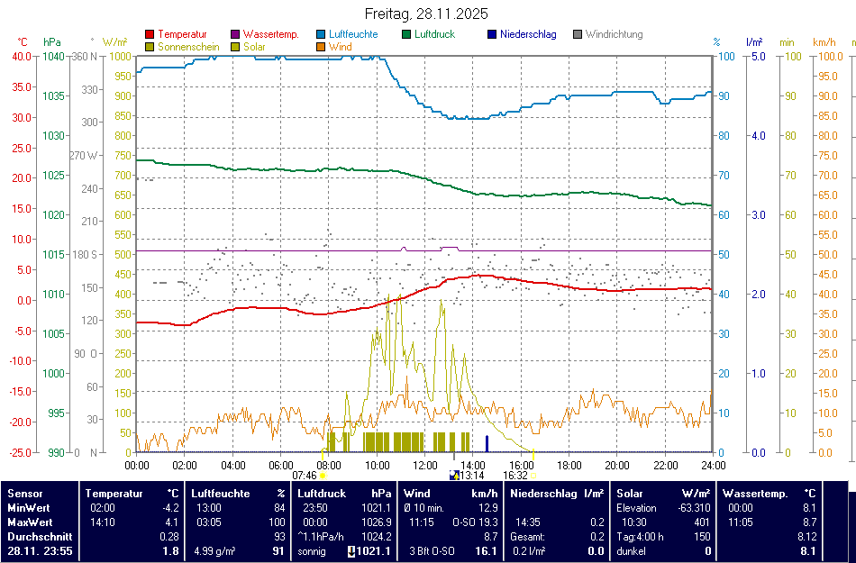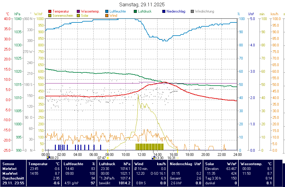 | 29.11.2025 | Höhe ü. NN | Zeit | Temperatur (°C) | Nieder- schlag | Luft- feuchte | Luft- druck | Wind |