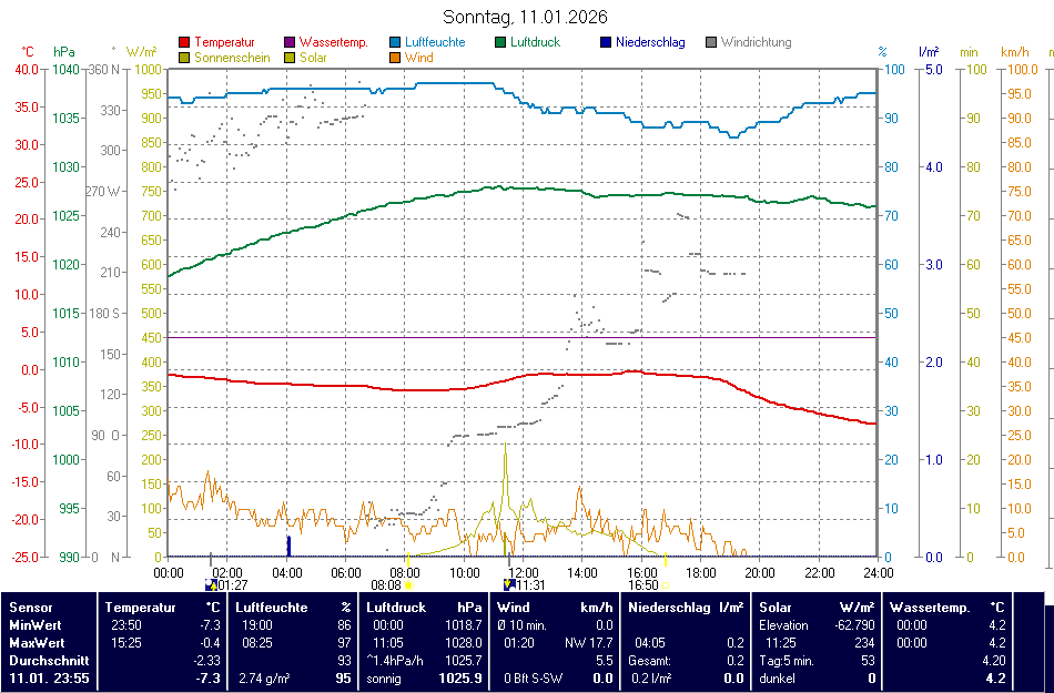 | 11.01.2026 | Höhe ü. NN | Zeit | Temperatur (°C) | Nieder- schlag | Luft- feuchte | Luft- druck | Wind |