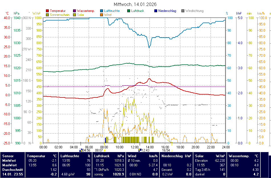 Reichenbach an der Fils343 m15:0513,93,5 (07:35)14,1 (14:35)0,4 l/m²66%1015,98,0 km/h (2 Bft) S14,5 km/h (3 Bft) W-SW (13:50)