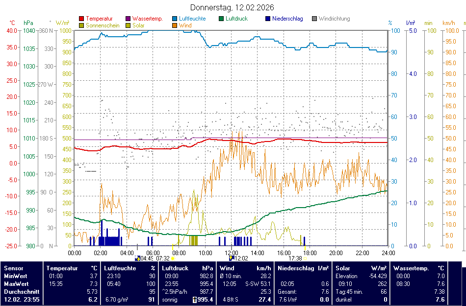 | Aldingen | 654 m | 04:41 | 2,9 | 2,4 (03:41) | 5,1 (14:14) | 0,0 l/m² | 89% | 996,4 | 14,5 km/h (3 Bft) SW | 48,3 km/h (6 Bft) W-NW (13:01) | | Allmannsweiler | 625 m | 04:42 | 3,9 | 3,8 (04:34) | 5,9 (00:01) | 0,0 l/m² | 94% | 995,5 | 30,6 km/h (5 Bft) W-SW | 41,8 km/h (6 Bft) W (02:30) | | Allmendingen | 541 m | 04:40 | 4,6 | 4,6 (06:05) | 5,7 (16:05) | 0,8 l/m² | 92% | 995,1 | 25,7 km/h (4 Bft) W-SW | 46,7 km/h (6 Bft) W-SW (12:35) | | Allmendingen, Fichtenstraße | 526 m | 01:10 | 5,7 | 5,4 (00:40) | 5,7 (01:10) | 0,7 l/m² | 92% | 992,4 | 8,4 km/h (2 Bft) W-SW | 8,4 km/h (2 Bft) W-SW (01:10) | | Altshausen | 574 m | 04:30 | 3,6 | 3,4 (03:53) | 5,1 (00:24) | 0,2 l/m² | 79% | 994,7 | 25,7 km/h (4 Bft) W-SW | 37,0 km/h (5 Bft) S (00:19) | | Amriswil (CH) | 430 m | 04:41 | 5,4 | 5,3 (04:34) | 6,7 (00:18) | 0,0 l/m² | 88% | 998,4 | 25,9 km/h (4 Bft) W | 40,3 km/h (6 Bft) W-NW (00:00) | | Amstetten-Reutti | 663 m | 04:40 | 3,9 | 3,4 (06:15) | 4,4 (11:35) | 1,6 l/m² | 86% | 994,9 | 24,1 km/h (4 Bft) SW | 74,0 km/h (8 Bft) W-SW (15:15) | | Amtzell | 564 m | 04:39 | 4,4 | 4,3 (04:35) | 5,6 (01:32) | 0,0 l/m² | 87% | 999,2 | 25,9 km/h (4 Bft) S | 43,6 km/h (6 Bft) S (02:57) | | Amtzell-Grenis | 677 m | 04:40 | 3,5 | 3,5 (04:40) | 4,6 (00:00) | 0,0 l/m² | 61% | 999,0 | 25,7 km/h (4 Bft) N | 25,7 km/h (4 Bft) N (00:30) | | Apfeltrach | 620 m | 04:41 | 4,3 | 4,3 (04:36) | 5,3 (00:04) | 0,0 l/m² | 88% | 996,0 | 20,9 km/h (4 Bft) W-SW | 37,0 km/h (5 Bft) SW (01:26) | | Aulendorf | 570 m | 04:40 | 3,8 | 3,7 (04:10) | 5,4 (00:00) | 0,2 l/m² | 89% | 996,2 | 22,5 km/h (4 Bft) S | 30,6 km/h (5 Bft) S-SO (00:38) | | Aulendorf, Steeger See | 548 m | 04:39 | 4,4 | 4,3 (04:06) | 5,9 (00:00) | 0,0 l/m² | 92% | 0,0 | 6,8 km/h (2 Bft) SW | 15,5 km/h (3 Bft) SW (00:03) | | Bachhagel | 489 m | 04:42 | 4,9 | 4,6 (01:51) | 5,3 (03:52) | 6,2 l/m² | 95% | 997,3 | 20,9 km/h (4 Bft) SW | 24,1 km/h (4 Bft) W (04:33) | | Bad Buchau, Adelindis Therme | 596 m | 04:42 | 3,8 | 3,8 (04:41) | 5,9 (00:07) | 0,0 l/m² | 89% | 995,3 | 45,0 km/h (6 Bft) S-SW | 56,3 km/h (7 Bft) S (01:17) | | Bad Krozingen | 233 m | 04:35 | 7,1 | 6,7 (03:40) | 7,6 (13:10) | 0,0 l/m² | 85% | 998,5 | 15,6 km/h (3 Bft) SW | 36,3 km/h (5 Bft) S-SO (06:10) | | Bad Krozingen-Hausen | 199 m | 04:40 | 7,3 | 7,0 (03:45) | 7,8 (12:55) | 0,0 l/m² | 85% | 997,6 | 18,3 km/h (3 Bft) W | 42,0 km/h (6 Bft) S-SW (06:05) | | Bad Krozingen-Schlatt | 214 m | 04:39 | 7,5 | 7,3 (03:36) | 8,1 (00:48) | 0,0 l/m² | 80% | 997,6 | 22,0 km/h (4 Bft) S | 34,9 km/h (5 Bft) S (03:11) | | Bad Krozingen-Schmidhofen | 252 m | 04:39 | 7,1 | 6,8 (03:23) | 7,6 (00:04) | 0,0 l/m² | 87% | 998,3 | 29,5 km/h (5 Bft) SW | 55,1 km/h (7 Bft) SW (02:31) | | Bad Krozingen-Tunsel | 229 m | 04:40 | 7,1 | 6,8 (03:35) | 7,6 (06:20) | 0,0 l/m² | 86% | 997,5 | 18,7 km/h (3 Bft) SW | 47,6 km/h (6 Bft) S (05:55) | | Bad Saulgau | 595 m | 04:38 | 4,0 | 4,0 (04:37) | 6,1 (00:07) | 0,0 l/m² | 89% | 994,7 | 30,6 km/h (5 Bft) W-SW | 32,0 km/h (5 Bft) W (02:55) | | Bad Saulgau, Mannsgrab | 588 m | 04:41 | 4,1 | 3,9 (04:32) | 6,1 (00:05) | 0,0 l/m² | 90% | 996,5 | 41,8 km/h (6 Bft) N | 41,8 km/h (6 Bft) O-SO (04:32) | | Bad Saulgau-Lampertsweiler | 627 m | 04:39 | 3,8 | - (-) | 5,8 (01:00) | 0,0 l/m² | 90% | 999,0 | - (0 Bft) N | 17,6 km/h (3 Bft) NO (01:00) | | Bad Schussenried | 572 m | 04:40 | 4,2 | 4,1 (04:40) | 6,2 (00:00) | 0,0 l/m² | 94% | 997,6 | 27,4 km/h (4 Bft) SW | 37,0 km/h (5 Bft) S (02:00) | | Bad Schussenried-Dunzenhausen | 590 m | 04:41 | 3,8 | 3,7 (04:39) | 5,9 (00:01) | 0,0 l/m² | 91% | 997,0 | 33,8 km/h (5 Bft) N-NO | 45,0 km/h (6 Bft) SO (03:03) | | Bad Schussenried-Reichenbach | 635 m | 04:39 | 3,6 | 3,5 (04:33) | 5,6 (00:02) | 0,0 l/m² | 89% | 997,1 | 33,8 km/h (5 Bft) W-SW | 40,3 km/h (6 Bft) W (02:14) | | Bad Schussenried-Steinhausen | 584 m | 04:41 | 3,9 | 3,9 (04:40) | 6,1 (00:00) | 0,0 l/m² | 86% | 996,7 | 20,9 km/h (4 Bft) N | 33,8 km/h (5 Bft) O (03:19) | | Bad Wurzach-Seibranz | 737 m | 04:42 | 3,2 | 3,1 (04:40) | 4,1 (00:08) | 0,2 l/m² | 91% | 996,5 | 40,3 km/h (6 Bft) SW | 64,4 km/h (8 Bft) SW (00:58) | | Badenweiler | 350 m | 04:39 | 7,0 | 6,8 (04:04) | 7,4 (00:01) | 0,0 l/m² | 78% | 997,7 | 10,7 km/h (2 Bft) SW | 33,7 km/h (5 Bft) SW (00:01) | | Baindt | 462 m | 04:41 | 5,1 | 5,1 (04:40) | 6,3 (01:01) | 0,0 l/m² | 88% | 998,3 | 16,2 km/h (3 Bft) SW | 33,8 km/h (5 Bft) W-SW (00:00) | | Balzheim-Unterbalzheim | 529 m | 04:39 | 4,5 | 4,5 (04:39) | 5,7 (01:43) | 0,0 l/m² | 91% | 995,8 | 11,2 km/h (2 Bft) S | 22,0 km/h (4 Bft) S (02:28) | | Bergatreute | 615 m | 04:40 | 4,6 | 4,6 (04:40) | 5,6 (00:00) | 0,0 l/m² | 93% | 701,2 | 16,1 km/h (3 Bft) SW | 30,6 km/h (5 Bft) SW (03:00) | | Biberach (Riss), Boehringer | 533 m | 06:00 | 5,0 | 4,9 (06:00) | 6,9 (01:50) | 0,0 l/m² | 85% | 997,8 | 10,4 km/h (2 Bft) N | 31,7 km/h (5 Bft) N (02:40) | | Biberach (Riss), Hölzle | 600 m | 04:39 | 3,9 | 3,8 (04:37) | 5,9 (00:02) | 0,4 l/m² | 88% | 997,7 | 27,4 km/h (4 Bft) O-NO | 45,1 km/h (6 Bft) SO (00:58) | | Biberach (Riss), Wolfental | 547 m | 04:39 | 4,1 | 4,1 (04:38) | 6,2 (00:28) | 0,2 l/m² | 88% | 997,3 | 13,7 km/h (3 Bft) O-NO | 27,4 km/h (4 Bft) O-NO (03:22) | | Biberach-Mettenberg | 605 m | 04:42 | 3,9 | 3,9 (04:40) | 5,7 (00:37) | 0,4 l/m² | 88% | 992,3 | 14,4 km/h (3 Bft) SW | 27,4 km/h (4 Bft) S (00:52) | | Biberach-Rissegg | 585 m | 04:40 | 3,9 | 3,9 (04:38) | 5,9 (00:04) | 0,0 l/m² | 89% | 996,9 | 19,4 km/h (3 Bft) SW | 32,2 km/h (5 Bft) W-SW (02:39) | | Biberach-Stafflangen | 594 m | 04:42 | 3,8 | 3,8 (04:40) | 6,0 (00:03) | 0,0 l/m² | 87% | 1000,1 | 22,3 km/h (4 Bft) SW | 46,1 km/h (6 Bft) W (01:17) | | Burgrieden-Hochstetten | 510 m | 04:35 | 4,9 | 4,9 (05:55) | 5,8 (10:20) | 0,2 l/m² | 90% | 995,4 | 14,5 km/h (3 Bft) SW | 46,7 km/h (6 Bft) W-NW (14:50) | | Donauwörth | 411 m | 04:38 | 5,8 | 5,3 (02:43) | 6,1 (00:03) | 1,2 l/m² | 87% | 992,9 | 15,5 km/h (3 Bft) S-SW | 22,3 km/h (4 Bft) S-SW (00:50) | | Dunningen | 666 m | 04:42 | 3,4 