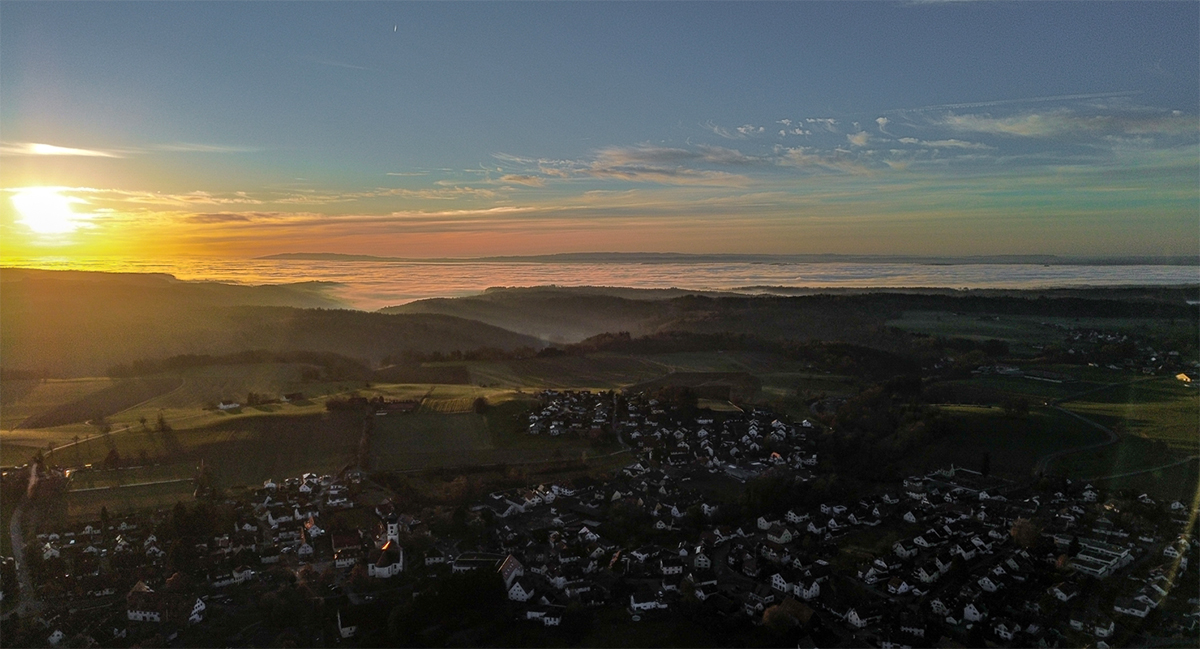 Blick von Bergatreute auf das nebelverhüllte Schussenbecken