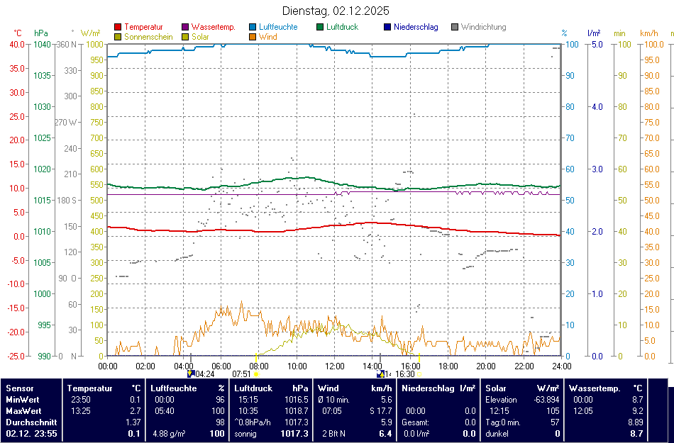 | 03.12.2025 | Höhe ü. NN | Zeit | Temperatur (°C) | Nieder- schlag | Luft- feuchte | Luft- druck | Wind |