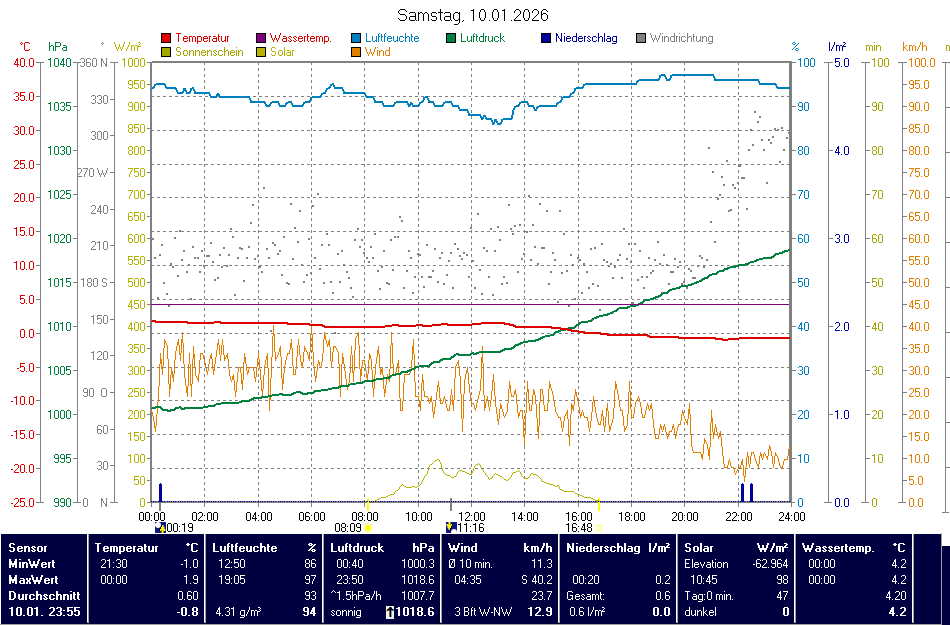 | 11.01.2026 | Höhe ü. NN | Zeit | Temperatur (°C) | Nieder- schlag | Luft- feuchte | Luft- druck | Wind |