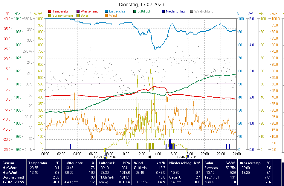 Dunningen-Seedorf673 m16:130,4-3,4 (06:28)1,8 (13:24)0,4 l/m²94%1009,56,5 km/h (2 Bft) NO14,4 km/h (3 Bft) NO (15:39)