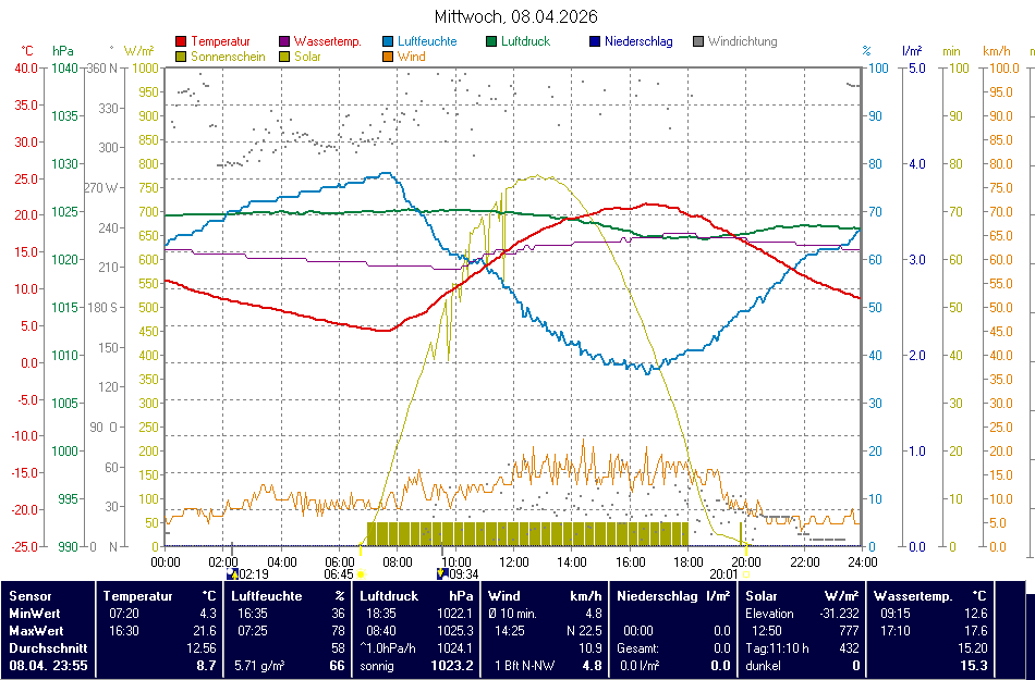 | 09.04.2026 | Höhe ü. NN | Zeit | Temperatur (°C) | Nieder- schlag | Luft- feuchte | Luft- druck | Wind |