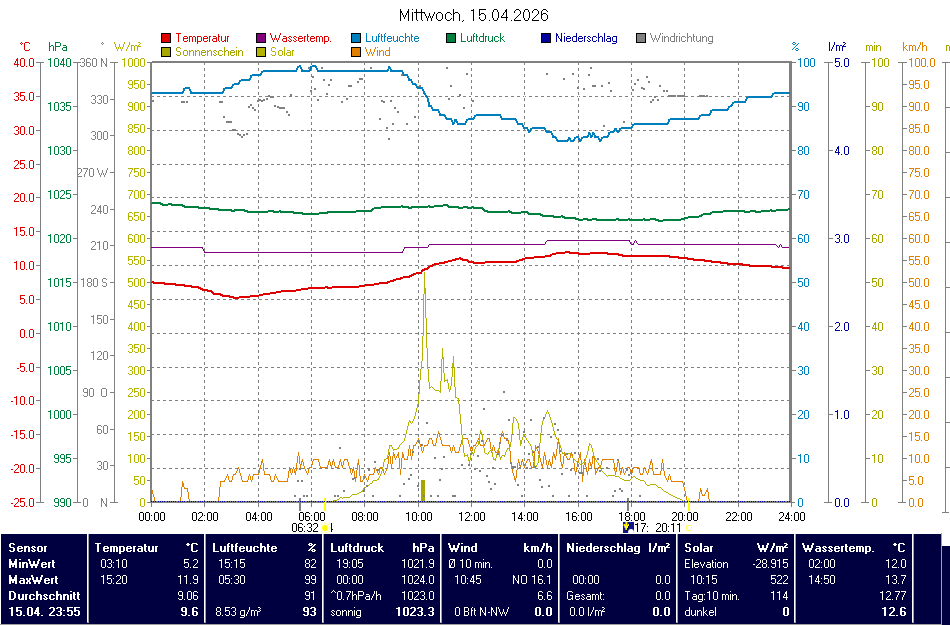 | Aldingen | 654 m | 19:11 | 7,5 | 0,9 (06:31) | 13,9 (12:07) | 0,0 l/m² | 77% | 1020,1 | 3,2 km/h (1 Bft) S-SO | 16,1 km/h (3 Bft) S-SO (14:04) | | Allmannsweiler | 625 m | 19:14 | 9,2 | 1,9 (07:16) | 15,7 (15:04) | 0,0 l/m² | 86% | 1019,5 | 0,0 km/h (0 Bft) N-NO | 20,9 km/h (4 Bft) W (11:37) | | Allmendingen | 541 m | 19:10 | 10,4 | -0,3 (06:15) | 16,1 (13:25) | 2,6 l/m² | 83% | 1020,0 | 4,8 km/h (1 Bft) NO | 25,7 km/h (4 Bft) S-SW (13:15) | | Allmendingen, Fichtenstraße | 526 m | 18:45 | 11,3 | 1,4 (06:51) | 15,5 (13:30) | 2,1 l/m² | 74% | 1020,8 | 0,0 km/h (0 Bft) SW | 22,0 km/h (4 Bft) N-NW (13:50) | | Altshausen | 574 m | 19:10 | 9,2 | -0,2 (06:42) | 15,6 (14:21) | 0,0 l/m² | 67% | 1018,2 | 0,0 km/h (0 Bft) N | 17,7 km/h (3 Bft) S-SW (11:15) | | Amriswil (CH) | 430 m | 19:13 | 8,7 | 2,7 (06:00) | 14,6 (15:41) | 0,0 l/m² | 82% | 1020,6 | 0,0 km/h (0 Bft) O-NO | 7,9 km/h (2 Bft) O-NO (16:02) | | Amstetten-Reutti | 663 m | 19:10 | 9,1 | 1,8 (07:15) | 14,8 (12:25) | 0,2 l/m² | 76% | 1020,6 | 3,2 km/h (1 Bft) W-SW | 27,4 km/h (4 Bft) S (15:35) | | Amtzell | 564 m | 19:13 | 5,3 | 0,2 (06:58) | 16,1 (15:32) | 0,0 l/m² | 88% | 1022,4 | 3,2 km/h (1 Bft) S | 16,2 km/h (3 Bft) O-SO (15:34) | | Apfeltrach | 620 m | 19:11 | 9,4 | 0,9 (04:05) | 17,3 (14:24) | 0,0 l/m² | 75% | 1021,0 | 0,0 km/h (0 Bft) W | 16,1 km/h (3 Bft) W-NW (13:04) | | Aulendorf | 570 m | 19:10 | 10,7 | 0,3 (06:49) | 15,6 (15:24) | 0,0 l/m² | 70% | 1019,9 | 1,6 km/h (1 Bft) N-NO | 20,9 km/h (4 Bft) S (12:06) | | Aulendorf, Steeger See | 548 m | 19:09 | 9,9 | -0,5 (04:42) | 17,0 (14:53) | 0,0 l/m² | 80% | 0,0 | 0,0 km/h (0 Bft) NO | 12,9 km/h (3 Bft) SO (15:54) | | Bachhagel | 489 m | 19:14 | 9,6 | -1,3 (07:14) | 16,4 (14:58) | 0,8 l/m² | 88% | 1024,1 | 0,0 km/h (0 Bft) O-NO | 22,7 km/h (4 Bft) W-NW (15:52) | | Bad Buchau, Adelindis Therme | 596 m | 19:14 | 10,6 | 1,1 (06:42) | 15,2 (14:50) | 0,0 l/m² | 74% | 1019,8 | 0,0 km/h (0 Bft) W-NW | 27,4 km/h (4 Bft) S-SW (11:52) | | Bad Krozingen | 233 m | 19:10 | 13,9 | 6,0 (05:50) | 19,5 (16:00) | 0,0 l/m² | 68% | 1020,1 | 0,0 km/h (0 Bft) O-SO | 19,0 km/h (3 Bft) W-SW (10:35) | | Bad Krozingen-Hausen | 199 m | 19:10 | 13,8 | 5,8 (05:40) | 19,6 (15:05) | 0,0 l/m² | 71% | 1019,4 | 0,0 km/h (0 Bft) N | 18,3 km/h (3 Bft) W-SW (10:10) | | Bad Krozingen-Schlatt | 214 m | 19:09 | 14,2 | 6,4 (04:12) | 18,8 (15:53) | 0,0 l/m² | 61% | 1018,8 | 3,6 km/h (1 Bft) O | 23,8 km/h (4 Bft) SO (10:20) | | Bad Krozingen-Schmidhofen | 252 m | 19:09 | 12,8 | 5,4 (06:15) | 19,3 (15:59) | 0,0 l/m² | 72% | 1020,0 | 16,6 km/h (3 Bft) SO | 25,6 km/h (4 Bft) S (10:36) | | Bad Krozingen-Tunsel | 229 m | 19:10 | 12,5 | 5,6 (06:10) | 19,3 (14:30) | 0,0 l/m² | 78% | 1019,2 | 0,0 km/h (0 Bft) N-NO | 20,4 km/h (4 Bft) W-SW (10:15) | | Bad Saulgau | 595 m | 19:12 | 10,9 | 0,9 (07:42) | 18,8 (15:13) | 0,0 l/m² | 68% | 1018,6 | 0,0 km/h (0 Bft) N | 19,4 km/h (3 Bft) W-NW (11:02) | | Bad Saulgau, Mannsgrab | 588 m | 19:13 | 8,9 | -0,7 (07:07) | 16,3 (15:13) | 0,0 l/m² | 80% | 1020,8 | 0,0 km/h (0 Bft) N | 24,1 km/h (4 Bft) O-NO (15:11) | | Bad Saulgau-Lampertsweiler | 627 m | 19:11 | 10,8 | - (-) | 15,7 (01:00) | 0,0 l/m² | 75% | 1022,5 | 11,2 km/h (2 Bft) W | 22,7 km/h (4 Bft) O-NO (01:00) | | Bad Schussenried | 572 m | 19:10 | 11,2 | 0,7 (07:00) | 17,0 (15:10) | 0,0 l/m² | 75% | 1021,4 | 4,8 km/h (1 Bft) NW | 22,5 km/h (4 Bft) SW (12:05) | | Bad Schussenried-Dunzenhausen | 590 m | 19:14 | 9,2 | 0,4 (07:28) | 15,2 (15:21) | 0,0 l/m² | 78% | 1021,1 | 8,0 km/h (2 Bft) O-NO | 25,9 km/h (4 Bft) N (15:28) | | Bad Schussenried-Reichenbach | 635 m | 19:11 | 9,8 | 3,7 (07:08) | 15,7 (15:19) | 0,0 l/m² | 76% | 1020,7 | 4,7 km/h (1 Bft) NW | 20,9 km/h (4 Bft) N-NW (11:48) | | Bad Schussenried-Steinhausen | 584 m | 19:10 | 9,9 | -0,3 (06:45) | 15,1 (14:50) | 0,0 l/m² | 75% | 1020,7 | 3,2 km/h (1 Bft) N | 19,4 km/h (3 Bft) NO (15:31) | | Bad Wurzach-Seibranz | 737 m | 19:13 | 5,2 | 1,7 (01:00) | 13,9 (15:02) | 0,0 l/m² | 87% | 1020,1 | 0,0 km/h (0 Bft) W | 25,9 km/h (4 Bft) W-SW (12:19) | | Badenweiler | 350 m | 19:09 | 12,3 | 6,6 (07:12) | 17,6 (15:58) | 0,0 l/m² | 69% | 1019,1 | 7,9 km/h (2 Bft) NO | 19,0 km/h (3 Bft) O (10:29) | | Baindt | 462 m | 19:10 | 12,0 | 0,9 (07:36) | 16,8 (16:32) | 0,0 l/m² | 74% | 1021,2 | 0,0 km/h (0 Bft) W-SW | 17,7 km/h (3 Bft) S-SW (13:19) | | Balzheim-Unterbalzheim | 529 m | 19:07 | 9,8 | 0,8 (06:31) | 17,3 (15:00) | 0,0 l/m² | 83% | 1019,2 | 0,0 km/h (0 Bft) S | 11,2 km/h (2 Bft) SW (11:44) | | Bergatreute | 615 m | 19:10 | 11,9 | 2,2 (07:10) | 16,1 (16:30) | 0,0 l/m² | 76% | 803,8 | 0,0 km/h (0 Bft) SW | 20,9 km/h (4 Bft) SW (11:40) | | Biberach (Riss), Boehringer | 533 m | 20:40 | 10,0 | 2,3 (09:20) | 15,8 (14:40) | 0,0 l/m² | 75% | 1021,1 | 0,0 km/h (0 Bft) N | 22,7 km/h (4 Bft) N (17:00) | | Biberach (Riss), Hölzle | 600 m | 19:10 | 10,4 | 2,1 (07:22) | 15,3 (13:00) | 0,0 l/m² | 72% | 1022,0 | 3,2 km/h (1 Bft) W | 22,5 km/h (4 Bft) SO (13:01) | | Biberach (Riss), Wolfental | 547 m | 19:13 | 8,4 | -1,7 (07:07) | 15,7 (12:46) | 0,0 l/m² | 81% | 1021,0 | 0,0 km/h (0 Bft) W-SW | 18,7 km/h (3 Bft) NO (11:40) | | Biberach-Mettenberg | 605 m | 19:10 | 8,9 | 2,2 (07:27) | 14,7 (12:58) | 0,0 l/m² | 80% | 1016,6 | 3,2 km/h (1 Bft) N | 19,4 km/h (3 Bft) NW (15:24) | | Biberach-Rissegg | 585 m | 19:15 | 10,0 | 1,1 (07:22) | 14,7 (14:24) | 0,0 l/m² | 76% | 1021,3 | 0,0 km/h (0 Bft) NW | 17,7 km/h (3 Bft) NW (15:44) | | Biberach-Stafflangen | 594 m | 19:12 | 10,1 | 1,2 (07:33) | 14,8 (14:28) | 0,0 l/m² | 75% | 1023,5 | 1,8 km/h (1 Bft) N | 20,5 km/h (4 Bft) N-NW (15:07) | | Burgrieden | 523 m | 17:15 | 12,9 | 0,7 (07:10) | 16,5 (14:45) | 0,2 l/m² | 65% | 1019,5 | 0,0 km/h (0 Bft) NO | 20,9 km/h (4 Bft) S (14:40) | | Burgrieden-Hochstetten | 510 m | 19:10 | 10,6 | 0,0 (06:45) | 16,7 (13:55) | 0,0 l/m² | 78% | 1020,1 | 0,0 km/h (0 Bft) W-NW | 19,3 km/h (3 Bft) SW (14:40) | | Donauwörth | 411 m | 19:08 | 10,3 | 0,6 (06:22) | 15,9 (15:24) | 0,6 l/m² | 78% | 1018,8 